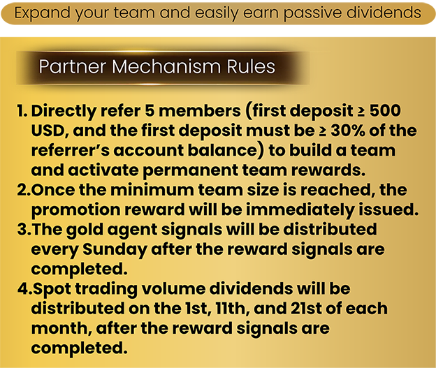 Reward Eligibility: The new member’s first deposit must reach $500 and be at least 30% of the referrer’s position in order to qualify for reward signals.