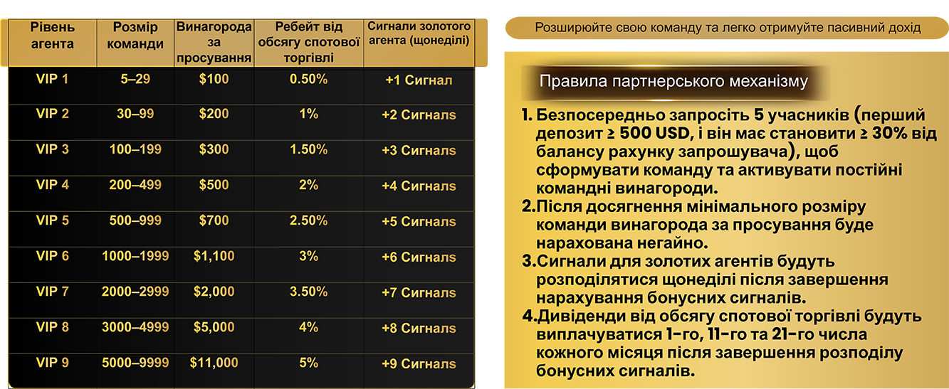 Умови отримання винагороди: Перший депозит нового учасника має становити не менше $500 і бути щонайменше 30% від позиції запрошувача, щоб мати право на отримання бонусних сигналів.