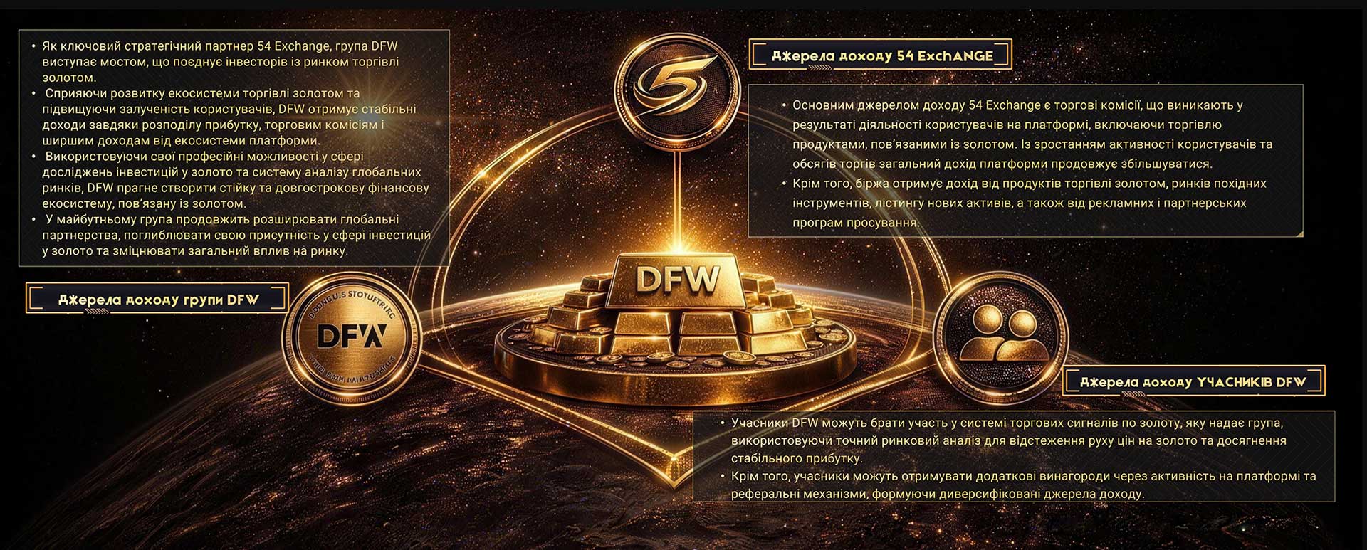 ЗАВДЯКИ ВСТАНОВЛЕННЮ ЗБАЛАНСОВАНОГО ПІДХОДУ МІЖ ПРИБУТКОВІСТЮ ТА СПІВПРАЦЕЮ, ГРУПА DFW, 54 EXCHANGE ТА ЇЇ ГЛОБАЛЬНІ УЧАСНИКИ СПІЛЬНО БЕРУТЬ УЧАСТЬ І ОТРИМУЮТЬ ВИГОДУ ВІД СТАЛОГО ФІНАНСОВОГО ЕКОСИСТЕМИ, ЗАСНОВАНОЇ НА ЗОЛОТІ. НИЖЧЕ НАВЕДЕНО СТРУКТУРОВАНИЙ АНАЛІЗ ДЖЕРЕЛ ДОХОДУ КОЖНОЇ СТОРОНИ, ЩО ЗАБЕЗПЕЧУЄ ПРОЗОРЕ ТА ВСЕБІЧНЕ РОЗУМІННЯ ЦІЄЇ МОДЕЛІ, ОРІЄНТОВАНОЇ НА СТВОРЕННЯ ЦІННОСТІ.